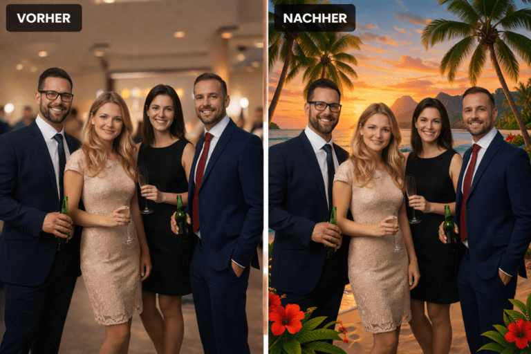 Mit der KI Hintergrundentfernung werden deine Gäste automatisch vom Hintergrund getrennt und in neue Szenen eingesetzt.