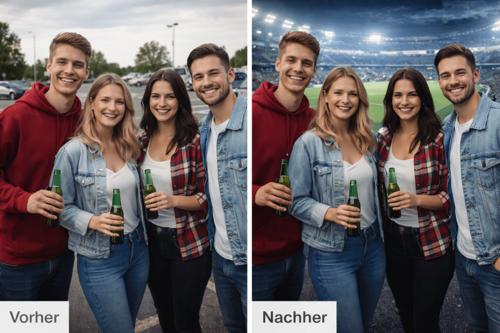 Die KI entfernt den Hintergrund automatisch und ersetzt ihn durch jede gewünschte Szene. So entstehen in Sekunden völlig neue Bilder, ohne Greenscreen oder aufwendigen Aufbau.